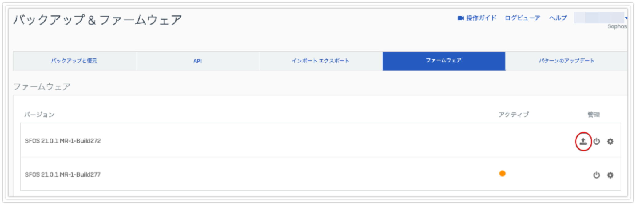 - Sophos Firewallの管理画面にログインし、左ペインメニューのバックアップ&ファームウェアのファームウェアのタブメニューから以下の画面に赤丸で囲った矢印のアイコンをクリックし、ダウンロードしたモジュールをアップロードします。